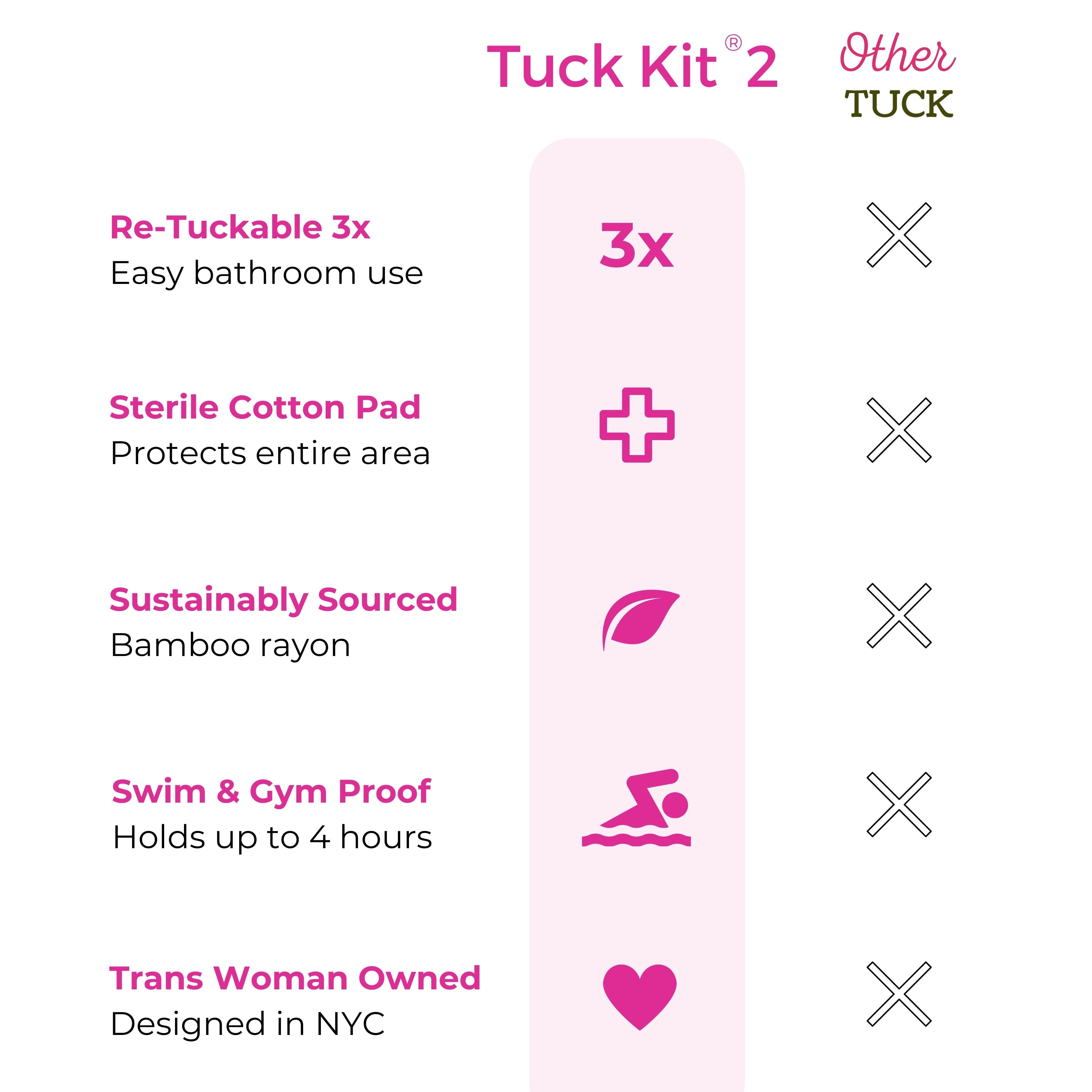 Tuck Kit 2 provides 2X the adhesive area for a more secure tuck that stays for up to 12 hours, 20% longer than the first Tuck Kit. Tuck Kit 2 also features a 40% larger and more shapely cotton pad for a more comfortable fit.