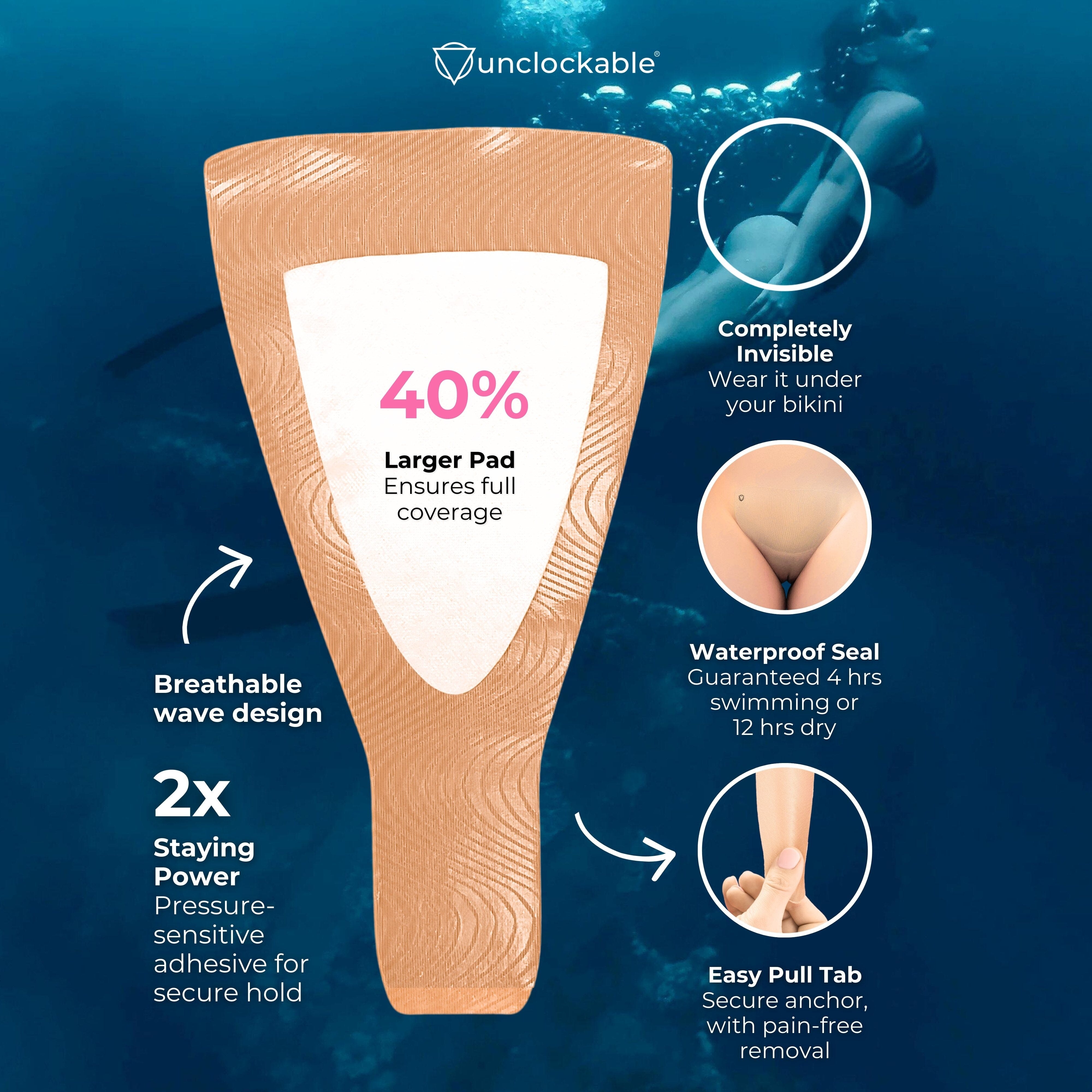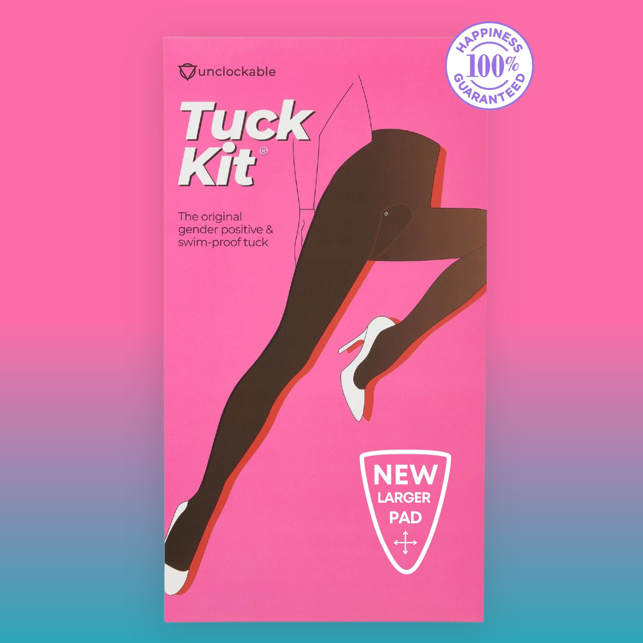 Unclockable invented Tuck Kit, the all-in-one solution for achieving a flat tuck that stays tucked. It's the only swim-proof and gym-proof tucking product. That's all made possible by T-Tape, our patented tucking strips included in each Tuck Kit.