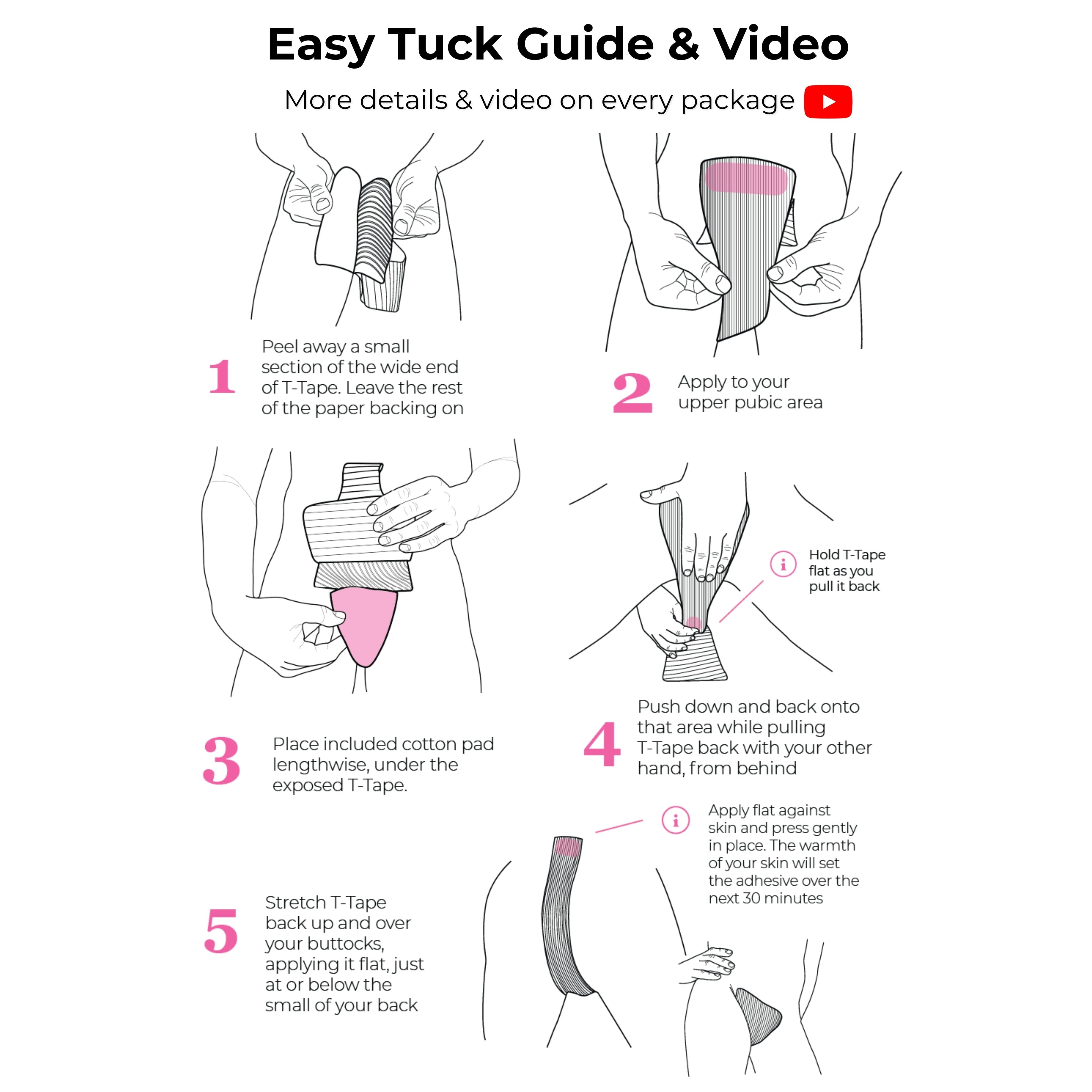 Tucking with Tuck Kit 2 is pain-free, by design. We use a soft, sterile cotton pad and hypoallergenic acrylic adhesive— both are clinical grade, and super breathable. The result is a product that stays put, but also moves with you and will never tug harshly on the skin when removed.