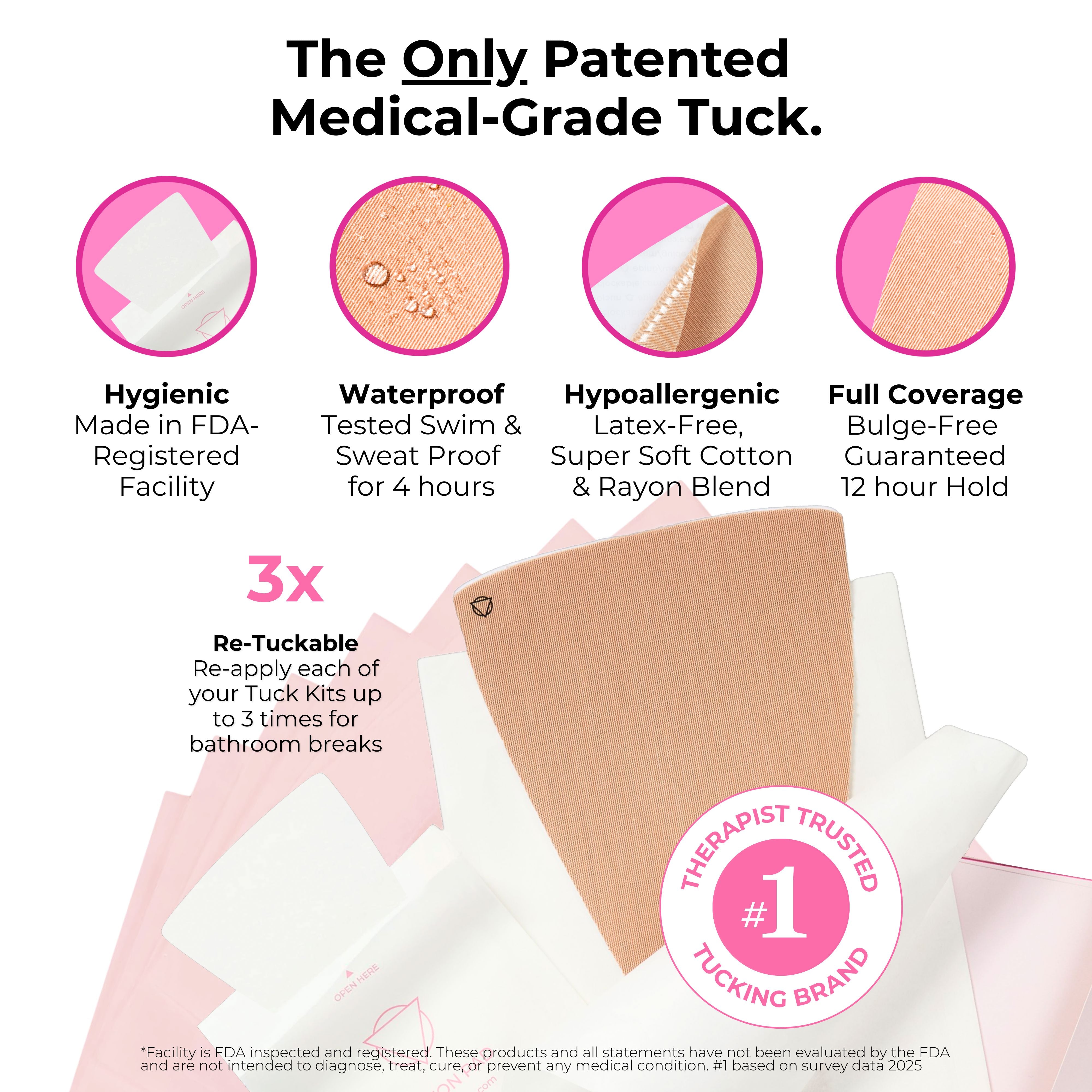 Tuck Kit is designed for single use, ensuring you get not only the flattest, most secure tuck but also the most hygienic, high performance tuck possible. Even when swimming or sweating, Tuck Kit guarantees the best waterproof hold. Plus, you can partially remove it from the back end and reapply it up to twice per wear for using the restroom. Made in a sterile, FDA-registered facility, each Tuck Kit ensures the highest standards of safety and quality. By using a fresh kit each time, you can always count on a safe, secure, and comfortable experience.
